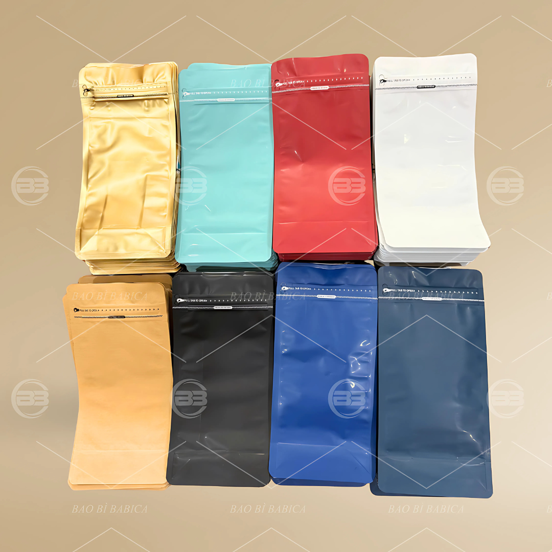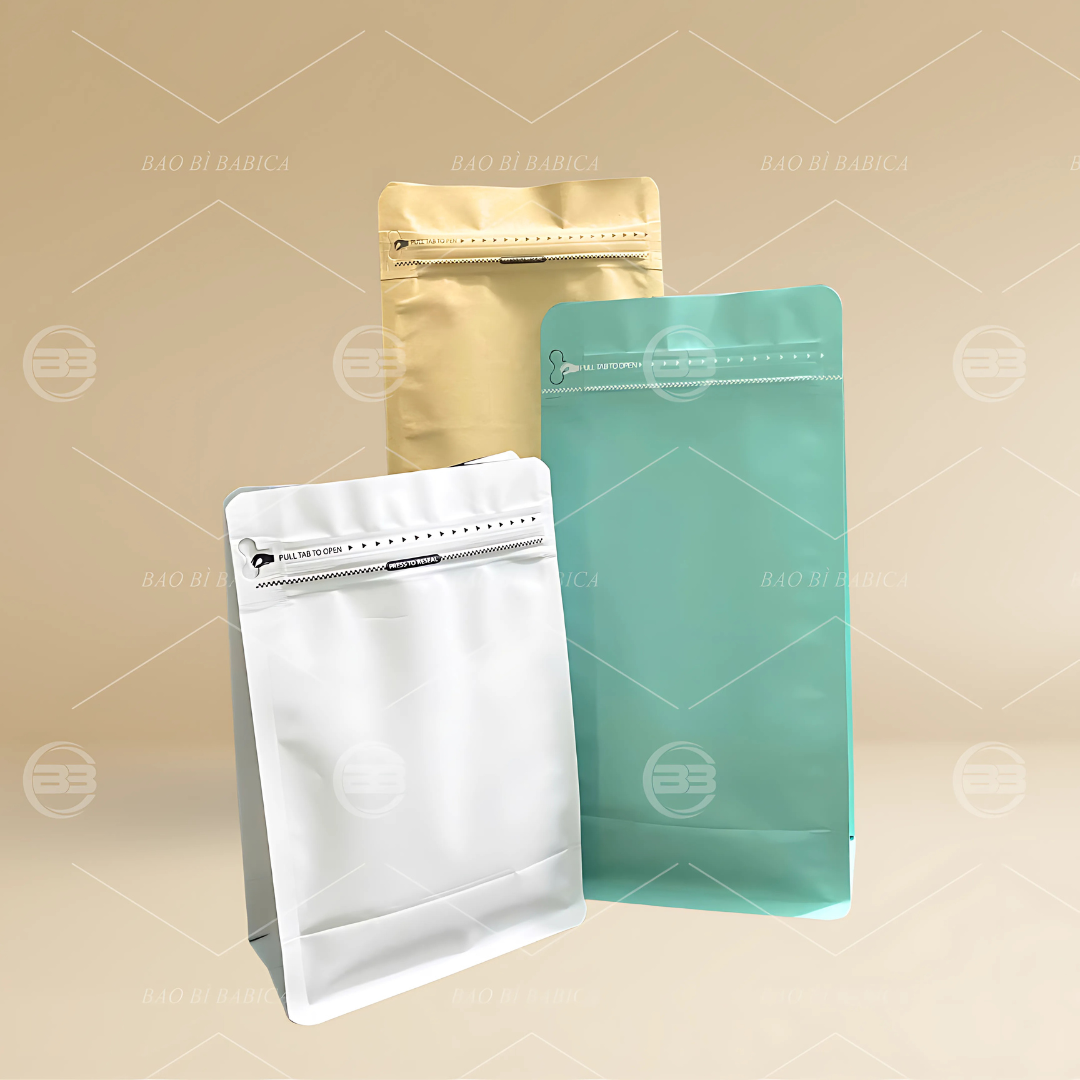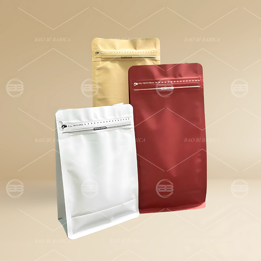 Ứng dụng: Được sử dụng rộng rãi trong ngành cà phê rang xay, bột cà phê, trà, ngũ cốc và thực phẩm khô cao cấp. Đây là lựa chọn tối ưu cho các thương hiệu muốn kết hợp giữa công năng bảo quản và hình ảnh bao bì hiện đại, sang trọng.